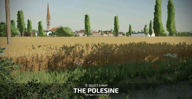 A flat region in northern Italy with small fields of medium size. It would be very difficult to drive large tractors between small country roads, rivers and old buildings.