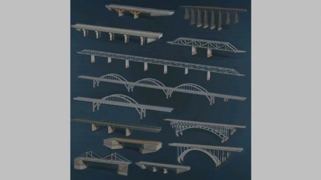 Pack of bridges. The bridges were borrowed from the Silverrun Forest map. There are 13 bridges in the pack: Connected Arch bridge (Triple bundle) Connected Arch bridge (One bundle) Arch Bridge (Type A) Truss Bridge (Type A) Truss Bridge (type B) Arch Bridge (type B) Girder Bridge (type A) Cable-stayed bridge Arch Bridge (type B) Girder Bridge (type B) Girder bridge (type C) Truss bridge (type C) Girder bridge (type D) Credits: GIANTS Software, INN |