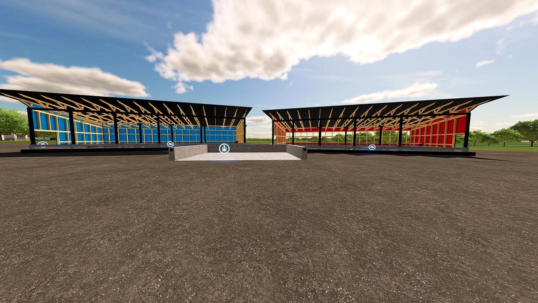 - 14 colors to choose from that will match any CC building. Changes from N upon purchase. - 3D tin siding and roofing - Snow mask - Trigger inside the big gate - In-game 3D Parallax Concrete - The exclamation mark will change the color of the trim. (White or Black) It takes a few seconds to switch back to black. - The open Monoslope can load straw from both sides, the closed one only from the front. - 150 heads of cattle Credits: Crooked Creek Modding |