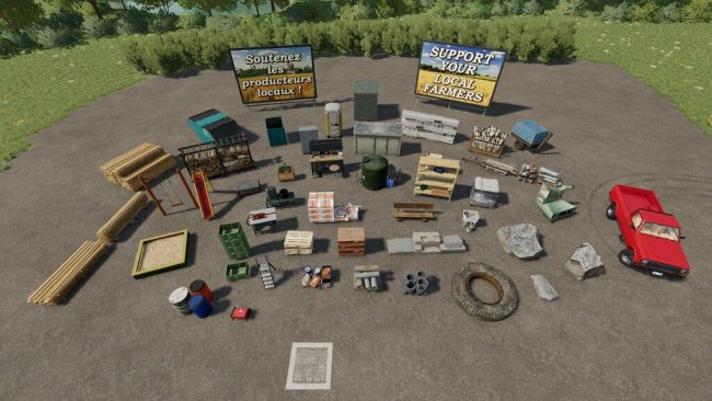 These are objects taken from all the maps of the base game, and I have made them available for placement. The package contains 45 different objects such as shelves, garbage, building materials, tools, stones and more to make your farm look more realistic and detailed. Credits: TrianglesTrouble |