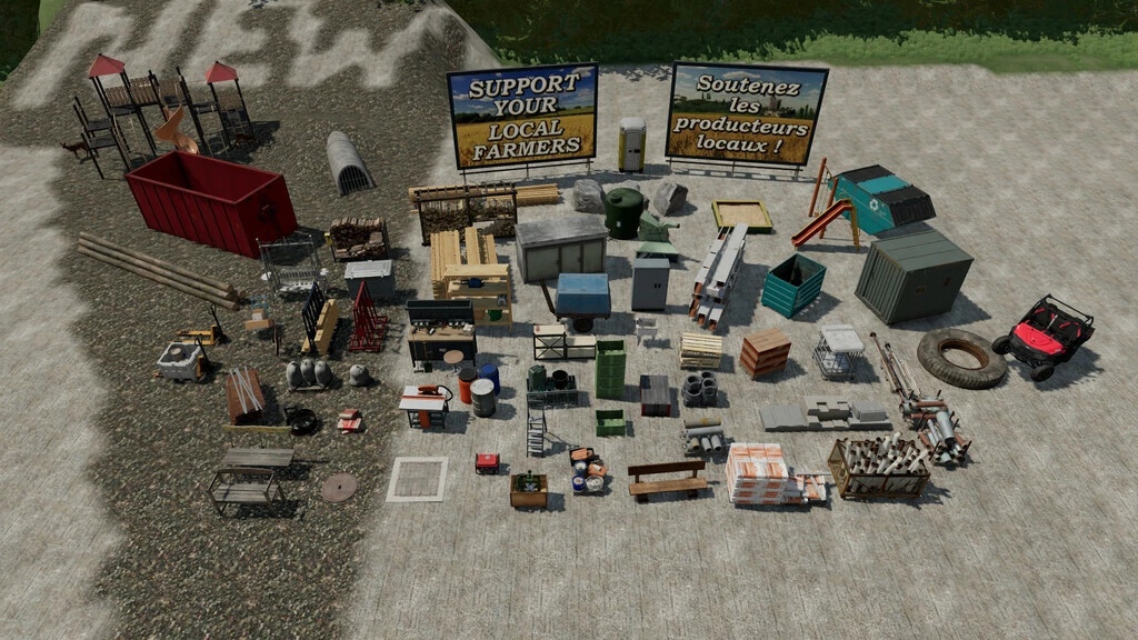 Mod Decorative Details Pack v1.1.0.0 for Farming Simulator 2022 These are objects taken from all the maps in the base game and I have made them available for placement. Version 1.1 changelog The pack contains 66 different objects such as shelves, trash, building materials, tools, rocks and more to make your farm look more realistic and detailed. CAUTION: For the drain pipe, adjust the terrain according to the object before placing it. Future expansions to follow... Credits: TrianglesTrouble |