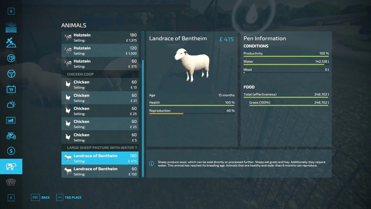 What about water costs? Sheep, like all animals, need water, and in FS22 you will have to pay extortionate daily amounts to water your animals. This paddock has a water trough that you can fill directly from the water tanks! It holds 150,000 liters of water! Enough for 300 sheep for a few months! Top up with cheap (or free) water every few months to keep your sheep healthy and boost their reproduction. Yes, you need water to keep them healthy! A bar has now been added to the Animal Info tab showing the amount of water currently in the paddock.