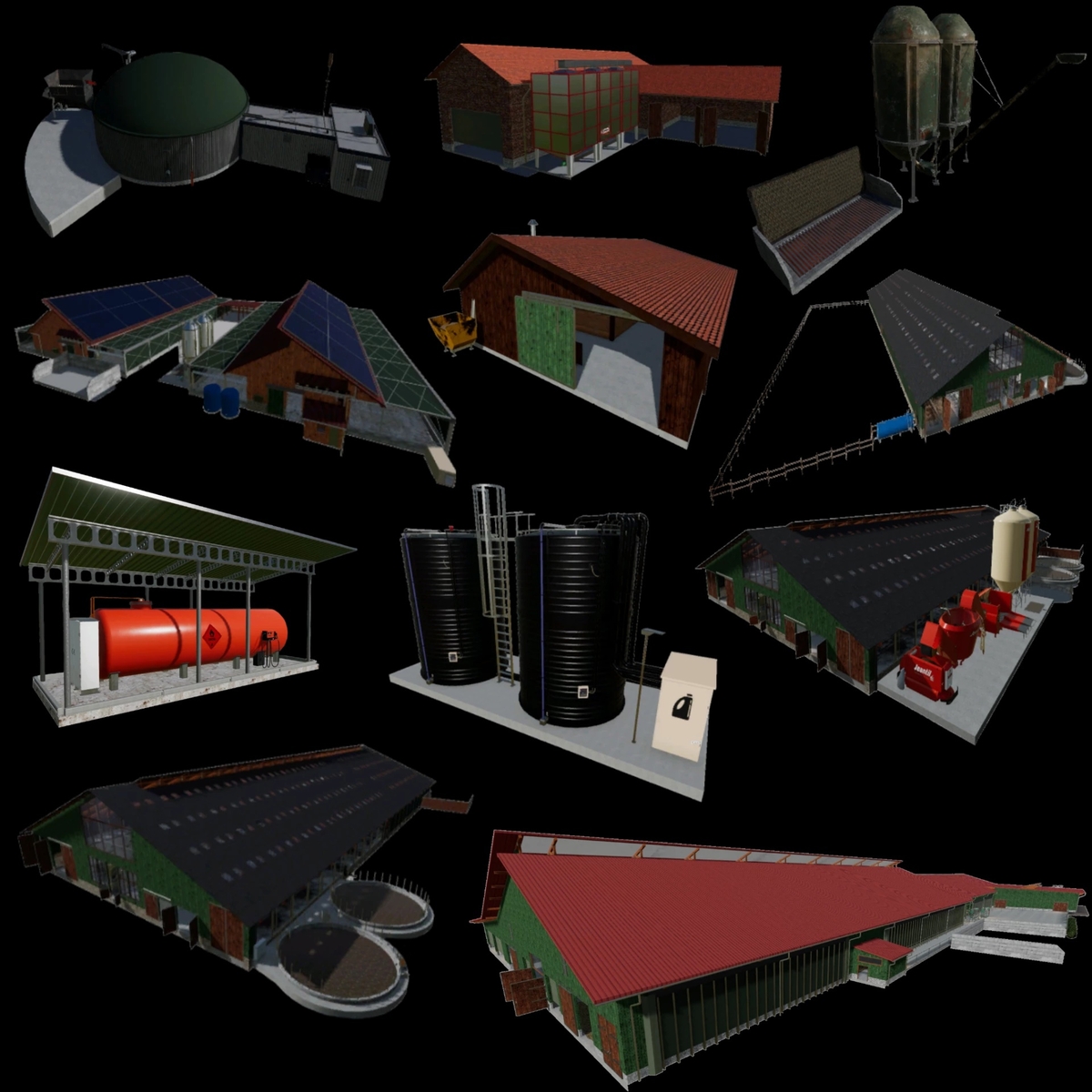 The package contains 5 stalls, hay dryer, farm gas station, farm silo, seed storage / lime storage / mineral fertilizer storage / liquid fertilizer storage / herbicide storage. More stables/silos will be added soon
