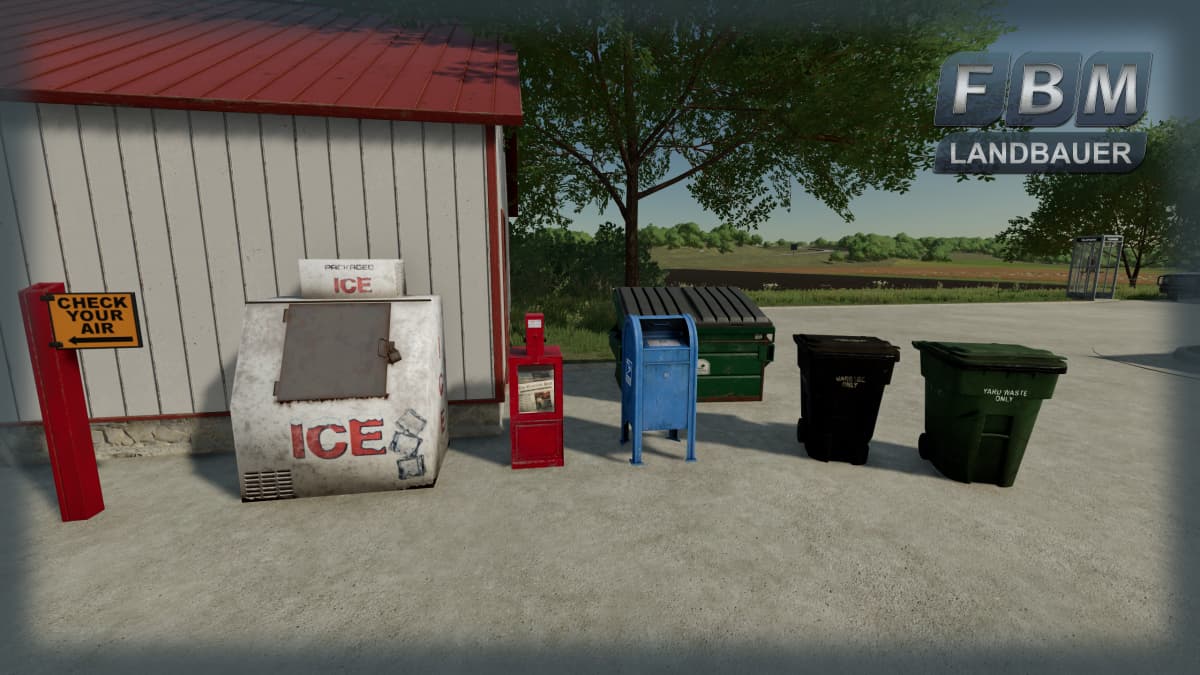 Mod [FBM22] Elmcreek Deko-Pack v1.0.0.0 for Farming Simulator 2022 Decoration set with 10 different models to place on the Elmcreek map or any other map of America. • Sign "Welcome to Elmcreek", price: 5000 euros. Information: The waste bins and the waste container can be moved manually. Credits: Forbidden-Mods |