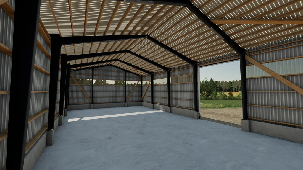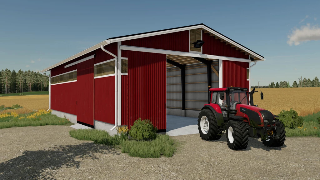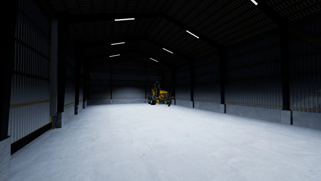 Machine shed measuring 11 x 20 m to store your machinery. It has two versions with a side door on the left or right. The interior lighting can be turned on at the junction box in the room next to the entrance doors. Outdoor lighting switches on automatically at night. Credits: Farmari99 |