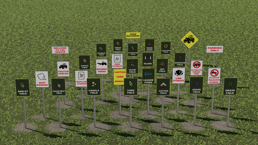 Mod Multiplayer Sign Pack v1.0.0.0 for Farming Simulator 2022 Hosted Server Sign Pack Price: 20$ - Sign types: Welcome Only agriculture Dust Warning Agricultural Machinery Notice Farm Animal Notice Tractor parking Implement parking No Parking No entry Storage Organization Signs Field crop signs