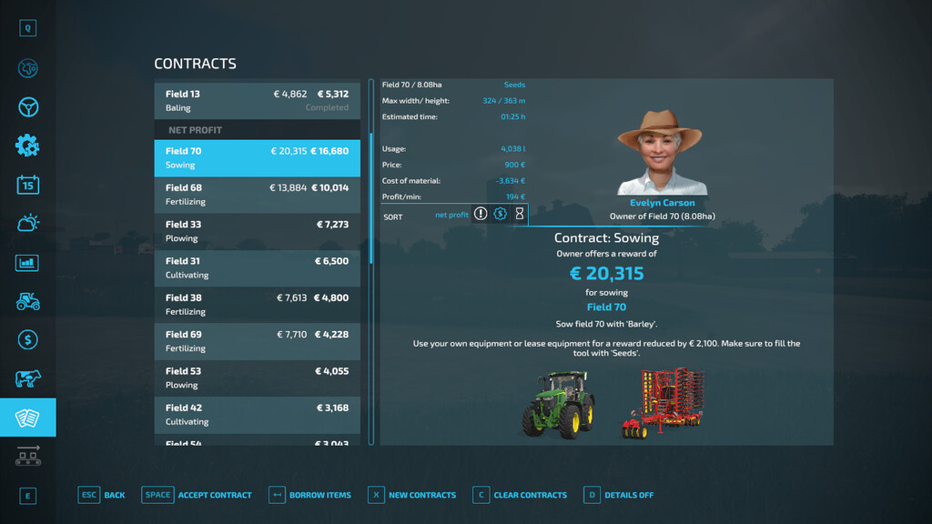 - Using the "Details" button, you can enable/disable the display of additional information about the contract. For example, cost estimates for the use of materials as fertilizers, herbicides, or seeds. For harvest and bale contracts, it shows the minimum amount to be delivered and the amount you can keep (and sell). From this, he calculates the total value of the contract profit, i.e. the fee minus the costs of the fertilizer/spraying/seeding contracts and the fee plus the value of the crop saved on the harvest/packing contracts. It even estimates the time you are likely to need to fully complete the job, taking into account the speed of work and the working width of the respective leasing vehicles/tools that are offered under the contract.