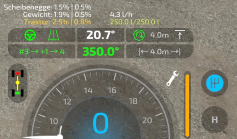This mod adds a track assistant, parking brake, differential lock, driving modes (full, RWD/FWD) and direct control of front/rear hydraulics and equipment for (motorized) vehicles. In addition, the HUD received a small update with a more detailed damage indicator, fuel tank level, fuel consumption, engine speed and temperature, as well as weight/total weight.