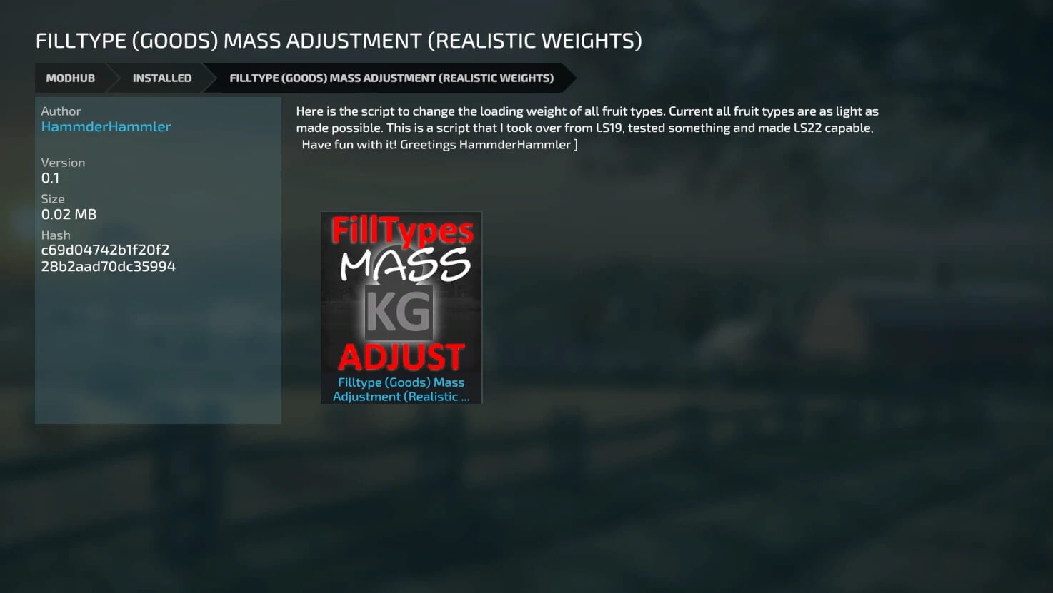 Mod FILLTYPE (GOODS) MASS ADJUSTMENT (REALISTIC WEIGHTS) V0.1 for Farming Simulator 2022 Here is the script to change the loading weight of all fruit types. Current all fruit types are as light as made possible. This is a script that I took over from LS19, tested something and made LS22 capable. Credits: HammderHammler |