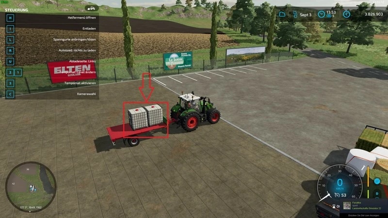 Activate loading with the [B] key, and then drive up to the pallet or bale to load it.