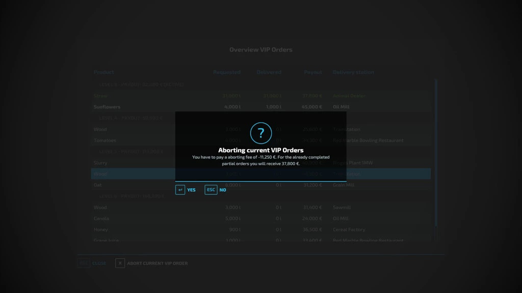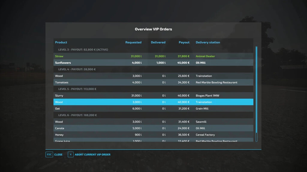The VIP Order Manager offers the farmer VIP orders consisting of several products to be delivered. For each product with explicit specification of the quantity to be delivered and the destination. In addition to the current VIP order, the next three VIP orders to follow can also be seen. However, only the current order can be delivered. With CTRL right + O the current order is displayed for a few seconds. ALT right + O displays the overview of all VIP Orders. In this view, you can also cancel the current VIP Order for a fee for the partial orders that have not yet been fulfilled. With each VIP Order, the current level is increased and thus also the number of individual orders contained and the quantities to be delivered are increased and the revenues are reduced. The area owned is also taken into account in the calculation. As the level increases, more products are also taken into account. Credits: Fetty42 |