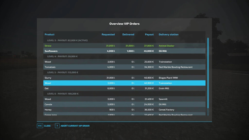 The VIP order manager offers the farmer VIP orders consisting of several products for delivery. For each product with an explicit indication of the delivery quantity and destination. In addition to the current VIP order, the following three VIP orders can also be seen. However, only the current order can be delivered. Update 1.1.0 - Consideration of already own livestock farms and industries - first small changes in multiplayer mode (not yet compatible with multiplayer mode) With CTRL right + O the current order is displayed for a few seconds. ALT right + O displays an overview of all VIP orders. In this view, you can also cancel your current VIP order for a fee for partial orders that have not yet been completed. With each VIP order, the current level increases, and thus also the number of individual orders and the quantities to be delivered increases, and the income decreases. The calculation also takes into account the area of the property. As the level increases, more products are taken into account. Credits: Fetty42 |