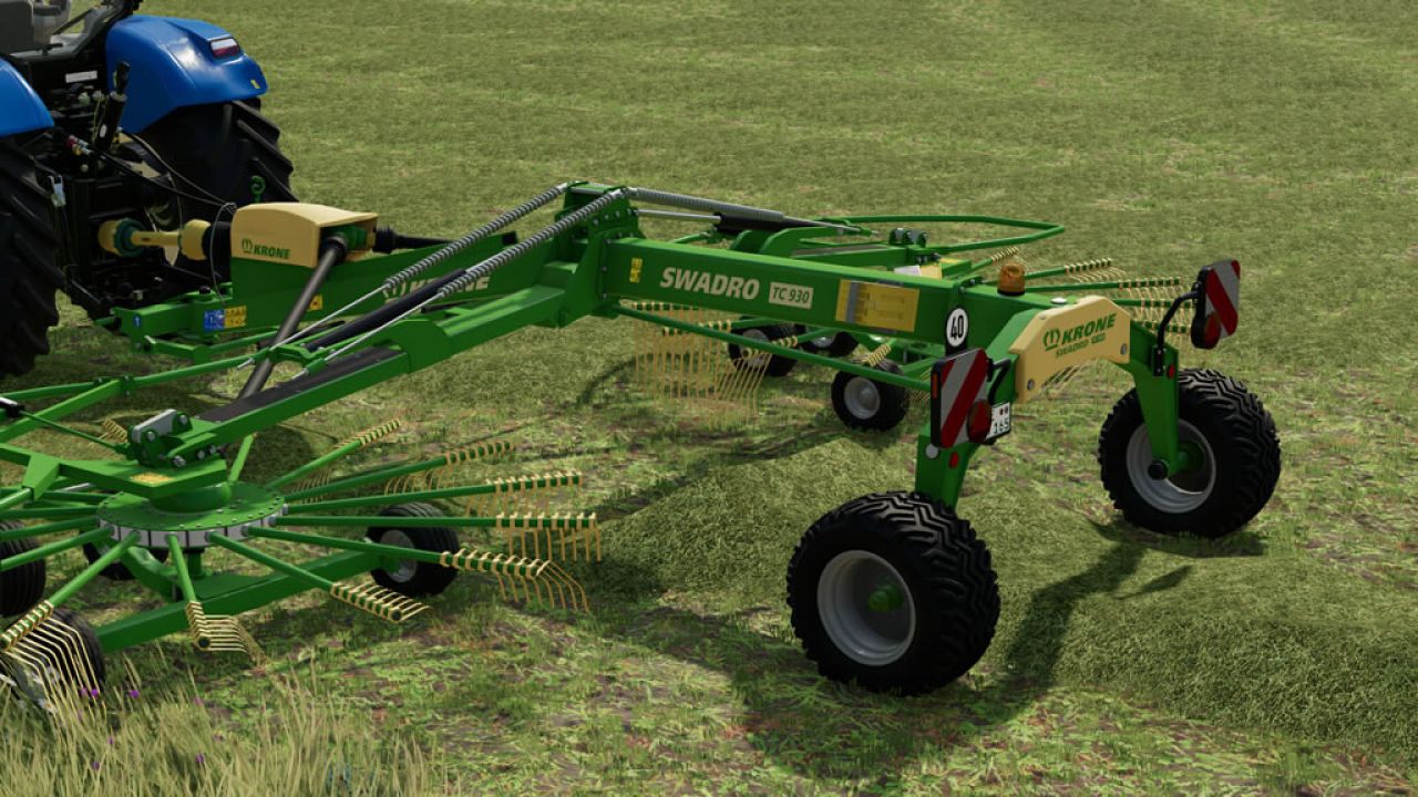 Trailed two-rotor rake with central feed. - Price: $33,000; - Variable width, mouse-controlled, from 8.1 to 9.3 meters; - Required power: 70 hp; - Body color configurations; - Wheel configurations; - Rim color configurations; - An additional beacon.