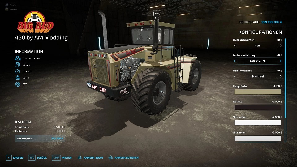 BigBud 450 from LS19 with some configurations This is a BigBud 450 conversion from LS19. Added color selection, a more powerful engine (600 hp), a choice of flashing lights and license plates with license plate illumination.