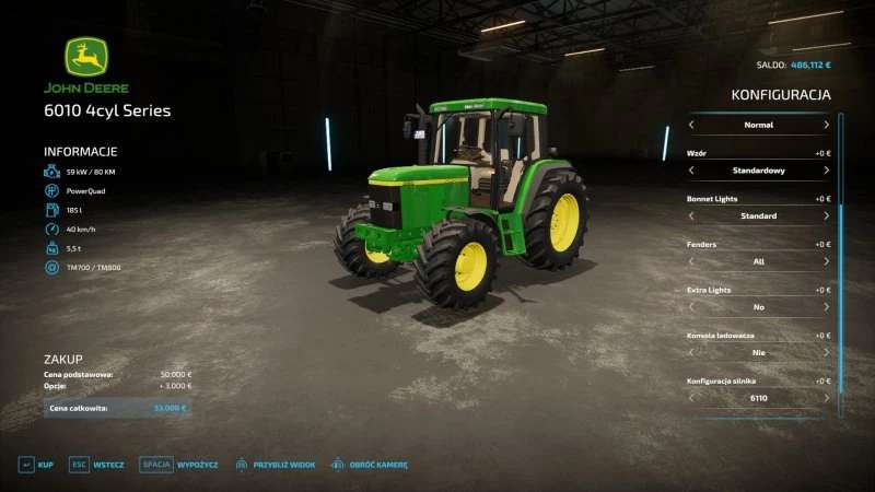 John Deere 6000 and 6010 series, 4 cylinders Price 6 000 4cyl: 40 000 € Power: 75-105 HP Maximum speed: 43 km Configurations: Models: 6100 - 75 hp 6200 - 85 hp 6300 - 95 hp 6400 - 105 hp — Editions - headlights on the hood - signal lights — Mudguards - Additional lights — Front loader Added simple IC (door) Price 6 010 4cyl: 50 000 € Power: 80-110 HP Maximum speed: 43 km Configurations: Models: 6100 - 80 hp 6200 - 90 hp 6300 - 100 hp 6400 - 110 hp — Editions - headlights on the hood - signal lights — Mudguards - Additional lights — Front loader SimpleIC (door) Credits: DB Modding |