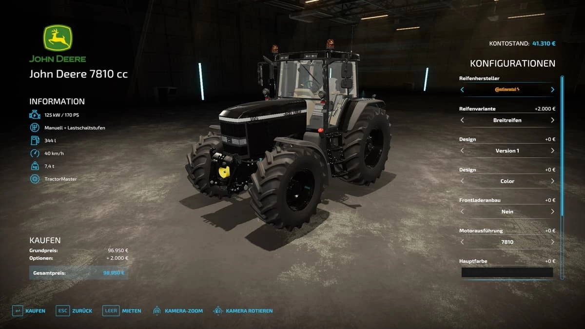 The store configuration has been changed to standard John Deere colors and tire configurations, so the player starts with a tractor of the base price and has a configuration of € 0 ... for me personally it is logical ...