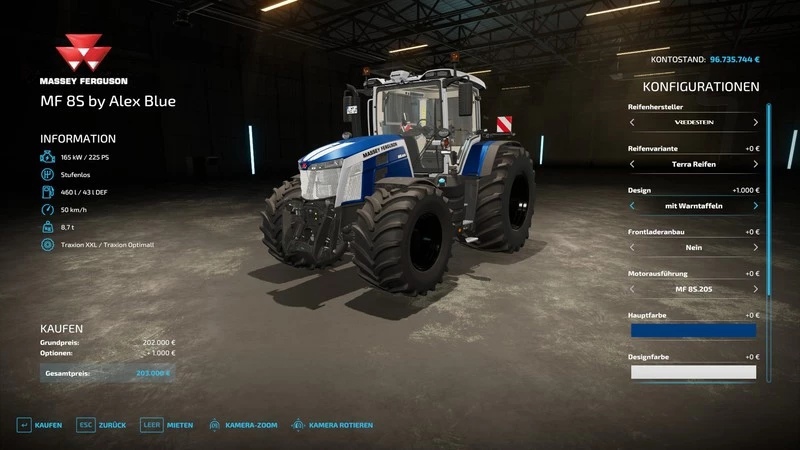 Mod MF 8S by Alex Blue v2.0.0.0 for Farming Simulator 2022 Alex Blue modification Specifications: Power 225 HP Speed 50 km / h Fuel tank 460 l. Price 202,000 euros