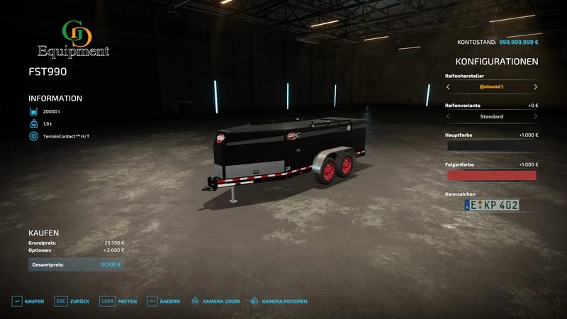 The large capacity diesel trailer (20000L) is ideal for supplying the lumberjack on the NF Marsh map. Diesel fuel is enough for about 2 months. What was done: - Capacity increased to 20000l - Increased repair interval - Added color selection - Added own brand as well as shop category Credits: GamingGonso |