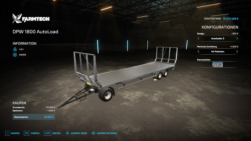 Mod FARMTECH DPW-1800 AUTOLOAD V1.0.9.0 for Farming Simulator 2022 Trailer with AutoLoad function. Requires the mod "Pallet Autoloader Specialization" from Achimobil. Version 1.0.9.0 1.0.8.0 - Cotton round bales can now be loaded - Trailer coupling attached (by MythosofModding) - New store picture V 1.0.7.0 V 1.0.6.0 Credits: Farmtech DPW 1800 Auto-Load |