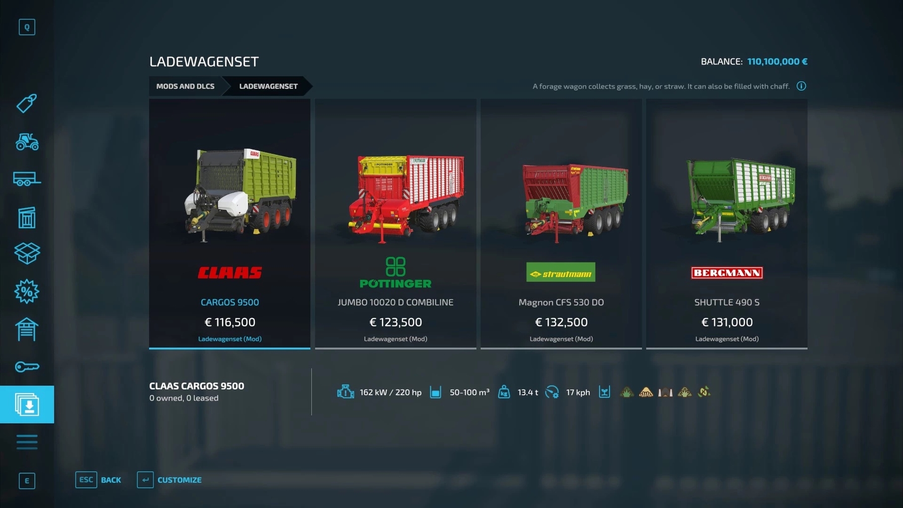 Mod Forage Trailers Pack v1.0.0.0 for Farming Simulator 2022 The set consists of 4 loader trailers for FS 22: Claas Cargos 9500 Pottinger Jumbo 10020 D Combiline Strautmann Magnon CFS 530 DO Bergmann Shuttle 490 S