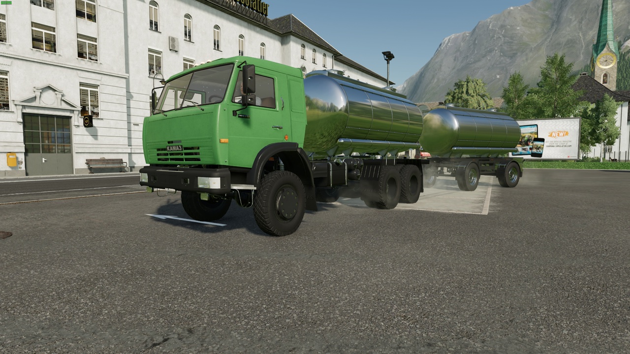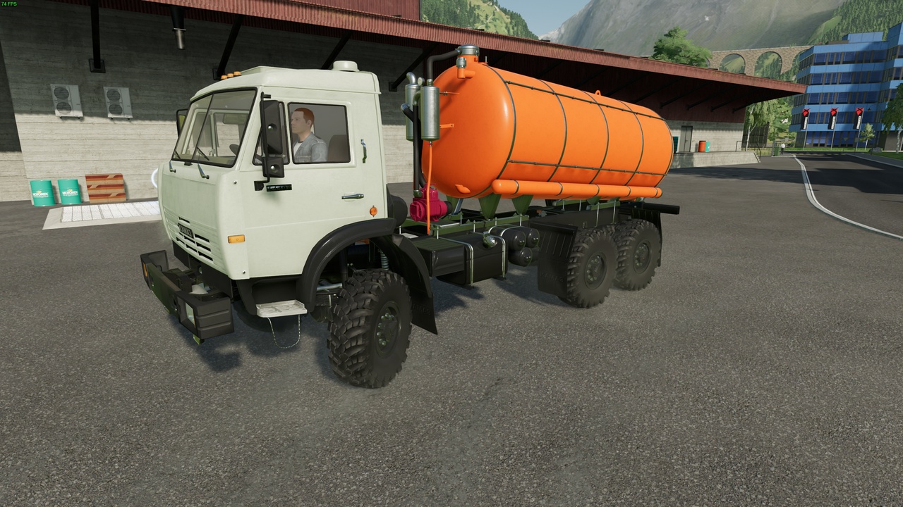 - Power: 240, 260 hp; - Speed: 90 km/h; - Fuel tank capacity: 210 l.; - Cost: 48 000 €; - Choice of cabin color; - Choosing the color of the barrel; - Rim color selection; - Barrel configuration; - Bumper / trim / mirrors / cab configuration; - Configuration of the sleeping bag; - Exhaust pipe configuration; - Pump configuration; - Configuration of the trailer device; - Wheel configuration; - Engine configuration; - License plate configuration; - Dynamic hoses; - Animated instruments, pedals, gearbox lever, gimbals, suspension, mudguards; - Working lighting equipment; - Working mirrors; - Leaves traces; - Gets dirty and washed; - Aging effect; - Volume: 8,000 liters. Credits: VolgaFS, KOVSH |