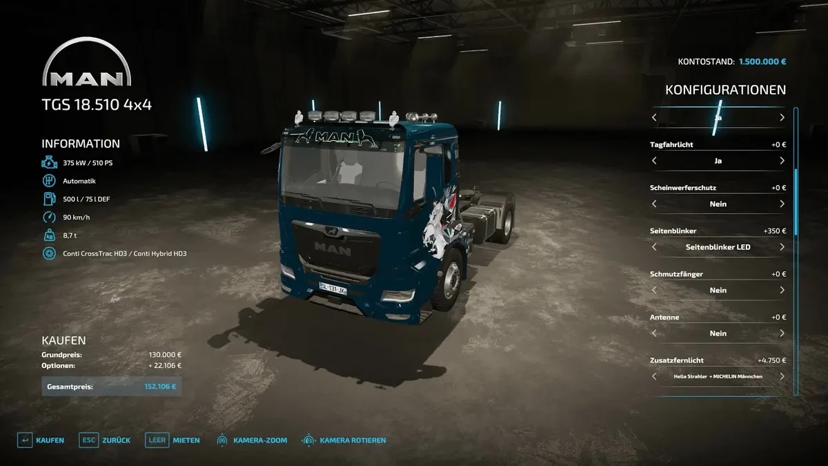 Minimum price: 130,000 Power: 243kW/330hp - 375kW/510hp Automatic gearbox Max speed: 90km/h Diesel tank: 500l / AdBlue: 75l 5 tire configs 15 config blocks 10 color configs passenger possible additional configurable lights