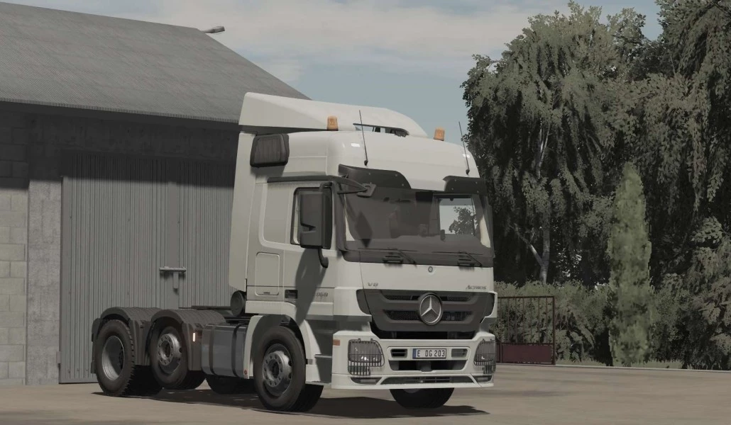 Mercedes Actros MP3 Truck for FS22. – Price: 182400; – Power: 598 hp; – Choice of chassis 6x4,6x2; – Semi-automatic/manual transmission; – Choice of design and color; – Working appliances and lighting equipment.