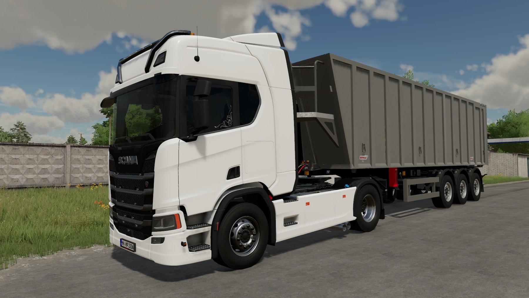MOD SCANIA R V1.0.0.4 FOR FARMING SIMULATOR 2022 - Power: 368 kW / 500 hp; - Speed: 90 km/h; - Volume of a fuel tank: 440 l.; - Cost: 130,000 €; - Choice of primary color; - Choice of design color; - Choice of rim color; - Configuration of accessories in the cabin; - Configuration of exhaust pipes; - Rock protection configuration; - Configuration of the kenguryatnik; - Bumper protection configuration; - Lightbox configuration; - Engine configuration; - License plate configuration; - Adjustable suspension; - Dynamic hoses; - Animated dashboard; - Working lighting equipment; - Working mirrors; - Leaves traces. v1.0.0.4 changes: - Adjusted engine sound and power; - Hirschfeld logo replaced with Pfenning logo; - Additionally added the logo of the company Gondle Forst; - The chassis is made more stable (Now it no longer fluctuates); - On the spoiler side lights are installed. Credits: Ap0lLo |