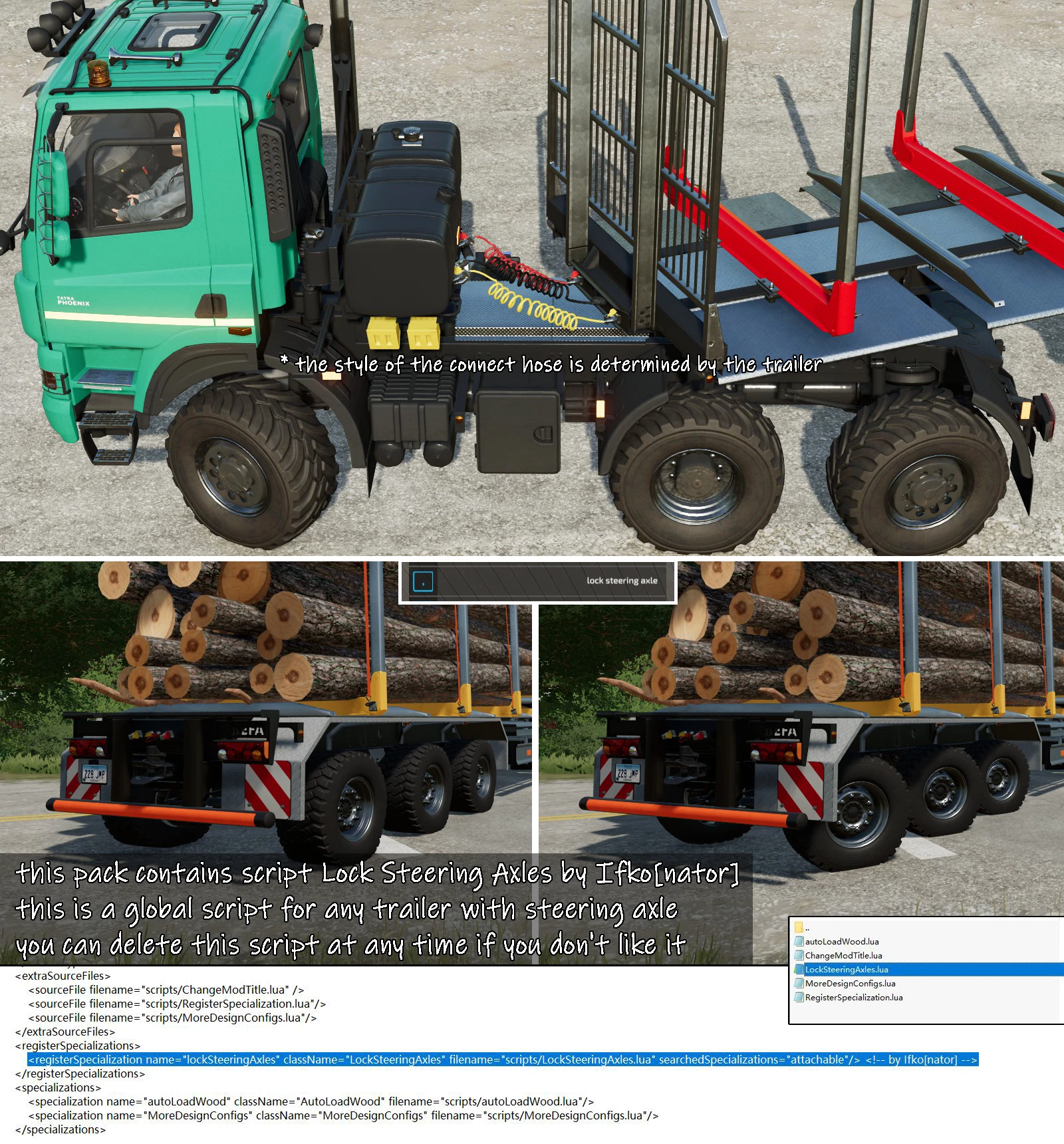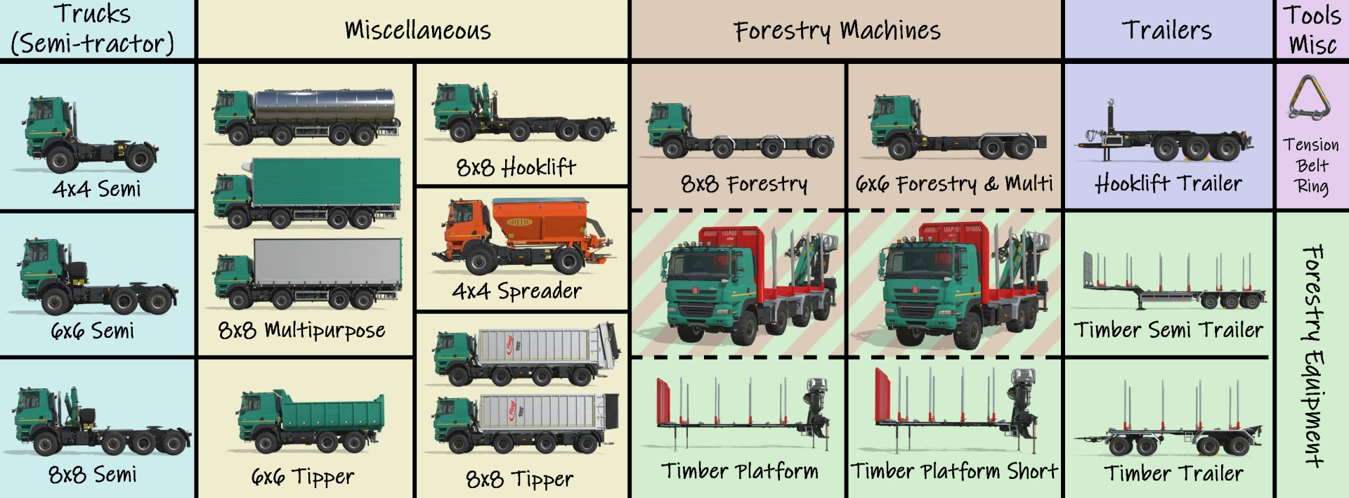 Here it come. A huge improvement based on FS19 original TATRA. The models are all from Giants and other excellent mod. Base on that I have made a lot of adjustments to both the model and texture to match the Tatra chassis and reduce appearance defects. Now it has a realistic tube beam suspension, numerous ic buttons and animation. Fully adjusting various suspension parameters to provide you with a more comfortable off-road driving experience. -Recommended mod: -Swap body support: Bulk Truck Bed Pack by Bcbuhler Please refer to the preview image for the characteristics and purpose of the vehicles and trailers in this pack. The rest of the details are left to you to explore. Notice: Several scripts are integrated in this file just for convenience. Including Auto Turn Off Turn Lights, Lock Steering Axles. If you don't need them, you could delete the corresponding script files and the corresponding code in modDesc.xml at any time. Free to share. v1.8.0.0 -Added 4x4 Spreader with front 3 point attacher for spraying roadsalt. However, due to game mechanics limitations, it can only be used for spraying roadsalt, not fertilizer or lime. -SkinnedMeshes have been added to its mudguard to allow it to swing. The rubber sleeves on the suspension now also have a realistic deformed appearance. -Fixed the triggering box of the tensionbelt to prevent trucks from occupying too much space and obstructing other AI vehicles. -The suspension height of all vehicles has been reduced by 0.05 meters to reduce the V-shaped appearance of the wheels. Credits: HatsuneKid |