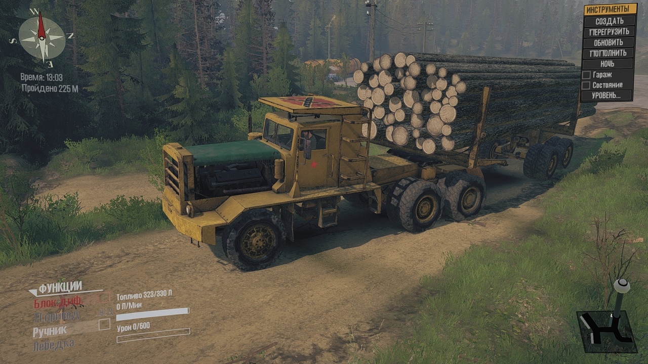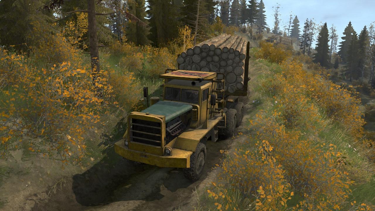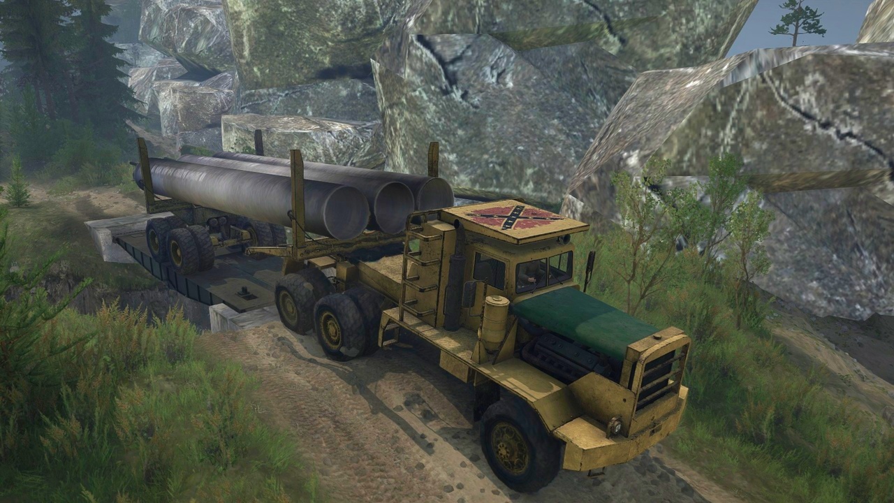 Mod HAYES HDX for Spintires: MudRunner Hayes_HDX of this model was produced in Canada in the 70s of the last century. The machine was intended for transportation of heavy loads in difficult conditions. Trucks were mainly equipped with Detroit Diesel V12 engines with a power of 500-700 hp. With poor handling and large dimensions, the car could take a big load at a time. The total weight of the truck with cargo reached 150t. In the game, the Machine is poorly controlled, has an average throughput and a mass of about 20 tons So far, only two trawls from heavy add-ons and dissolution. Cargo until one logs 8 points. Dissolution is also a semi-trailer and can be uncoupled as empty or with a load. It can also be folded. To fold the dissolution, you must first pull it up to the machine, and then lift the hitch. The trawl can be used to transport heavy machinery; it was made to transport a 50t container loader. Credits: Glushak |