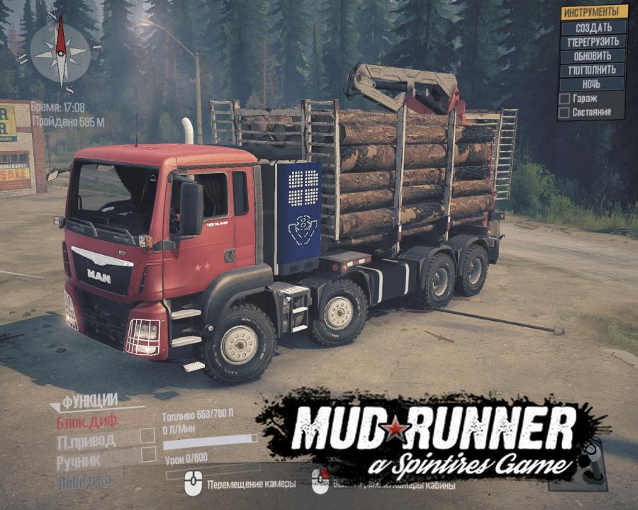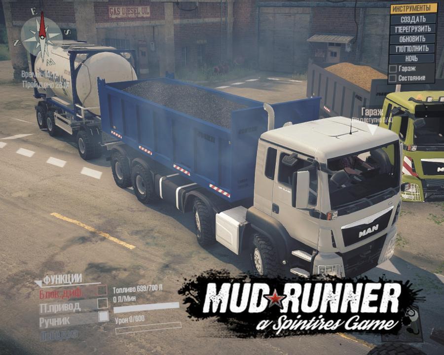 Mod MAN TGS 18.480 for Spintires: MudRunner From what I remember: Added hitch. I do not remember whose it is. Added two cargo, sand and asphalt. Loads from Master Shadow, wheels from him. The same sand and asphalt can be put as garage parts in a high body dump truck. The addons are rewritten; they should not overlap with the Stimov ones. Added auto colors, added specs to some textures. Re-texture some textures. Changed the weight of the car. Added addons from other mods. Removed coupling for semi-trailers. In multiplayer work. Credits: Nicklegosta |