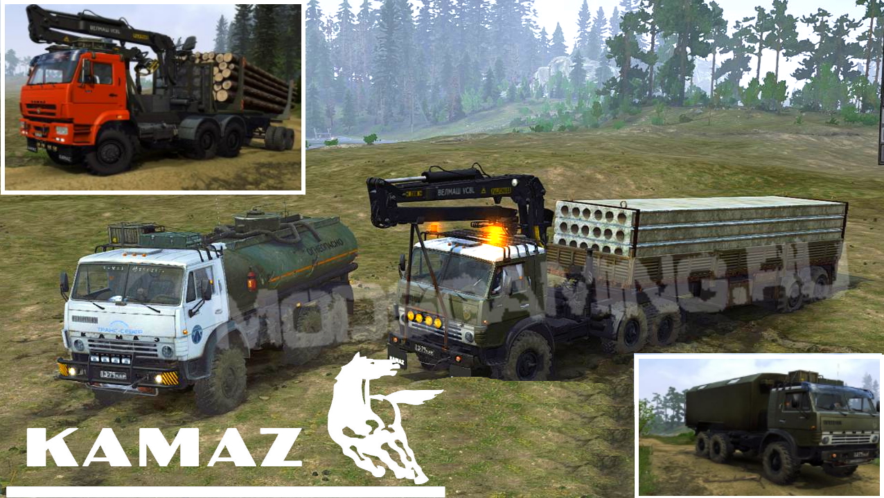 Kamaz 4310 (timber truck), Kamaz 65222 timber truck and Kamaz 44108 (tractor). All have modified XML and standard cross-country ability Kamaz 4310 (Kamaz-4310 "Bezon" (Author: Bezon)): - New textures; Kamaz 65222 (Kamaz-65222 (Author: RAMAXA)): - New textures; Kamaz 44108 (Kamaz 44108 turbo (Author: «HAUS 55 RUS»)): - Addons changed; Thanks to everyone whose mods/materials were used! Version 3 for Spintires: MudRunner (v25.02.21): - Added Kamaz 43102 with a sleeper cabin (Kamaz-43101(M) 43102(M) (Author: CyMpak)). 65222: - Added a second truck with different wheels; Credits: ojalaaki, КамАЗ-4310 «Bezon» |