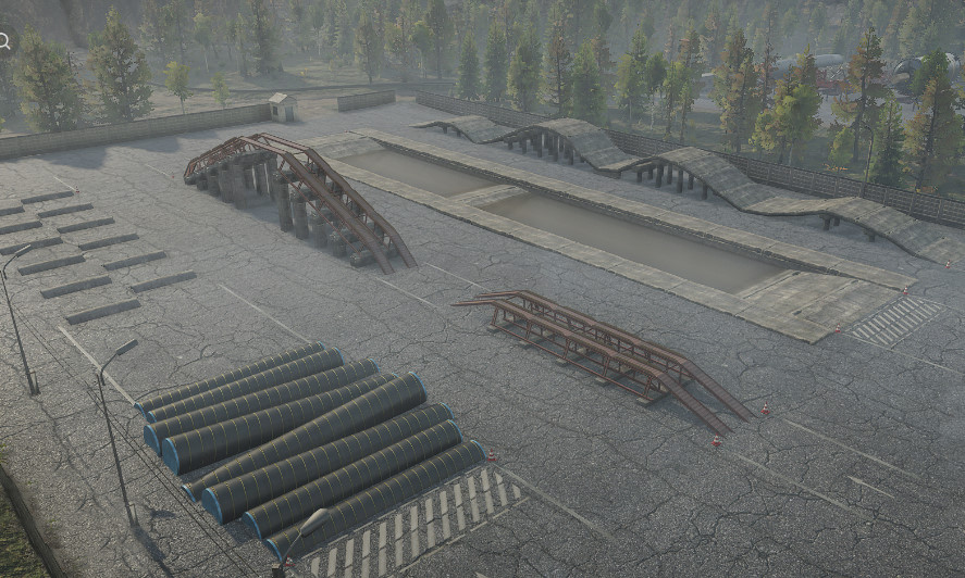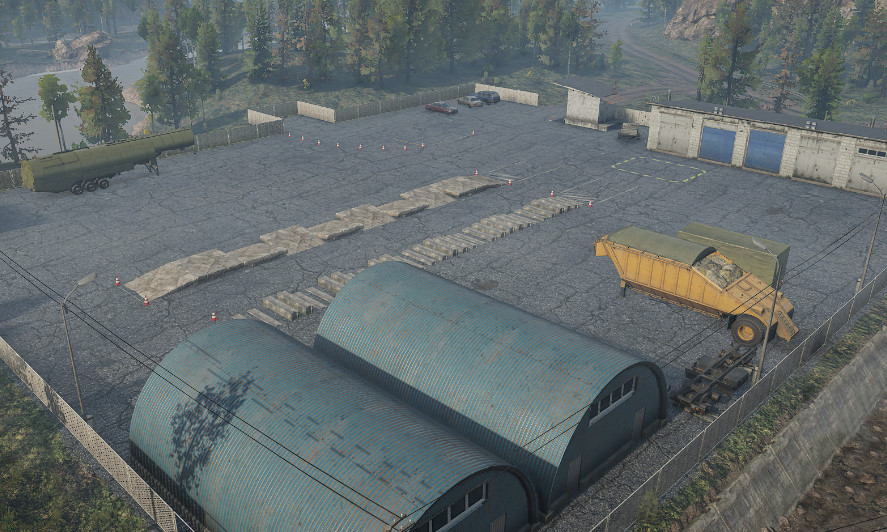 This is a testing ground for technology! At the beginning of the game, approach the blue circle, at the checkpoint, to open the map and get a level with money. There is a garage and trailer shops on the map. Also filling stations and warehouses.