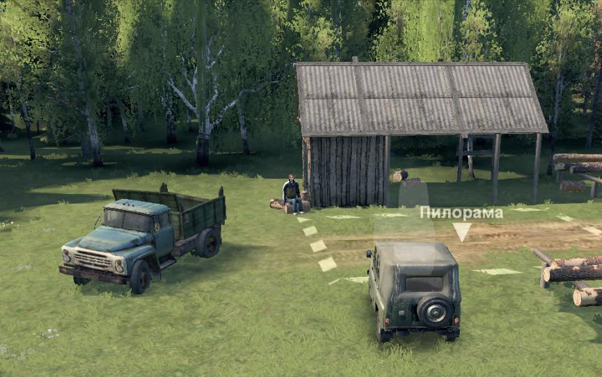 On the map: - 1 felling site; - 1 loading point; - 1 garage; - 1 gas station; - 5 sawmills; - 5 slots (replaceable). Third-party objects present