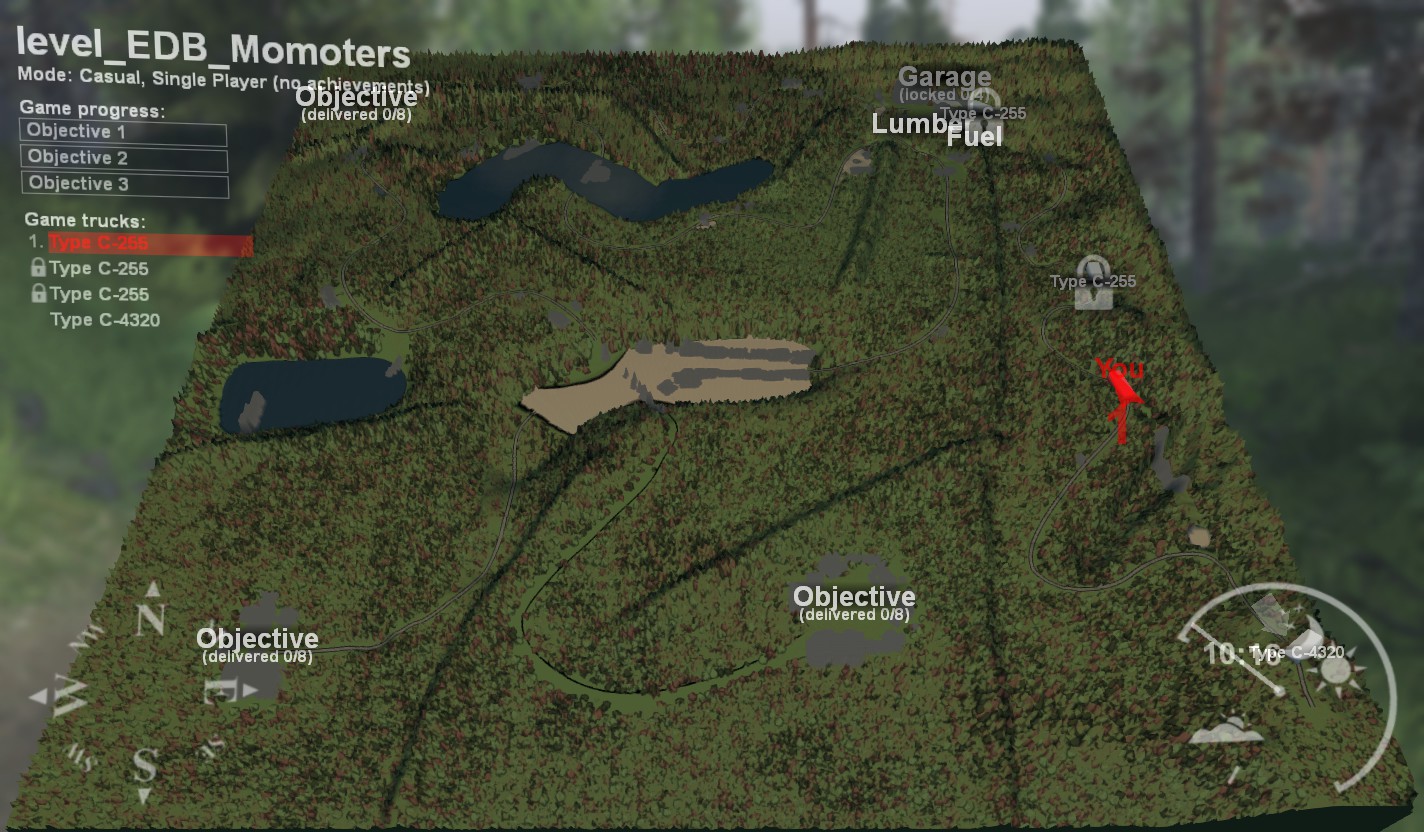 I Always love logging map that contains a narrow roads, muddy and uneven terrain. This goal does not have the same goal. TLDR; So, its Narrow, muddy, uneven, tricky and different path for every objective. Garages: 1 (lock) Truck lock: 2 Truck unlock: 2 Fuel Stations: 1 Objectives: 3 Lumber Points: 1 Credits: Eldibo Afif |