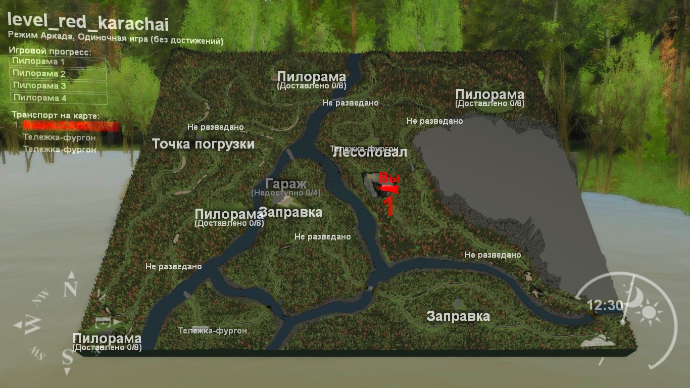 The map of size 30*25. The map was done on the real terrain. On the map: - 1 Garage (closed) - 2 Refill - 1 logging - 2 Point loading - 4 Sawmill - 6 points of intelligence - Auto start: 2 Garage truck + 4 Slots