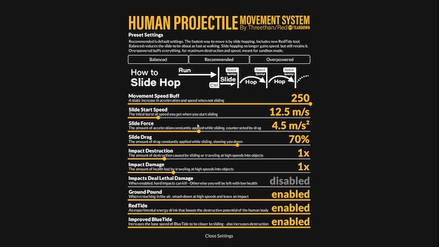 The mod improves the movements of the game character in Teardown by adding jumping, sliding, hitting the ground, damage when hit from a great height. It has its own physics settings and new sound effects. Credits: Threethan/Red |